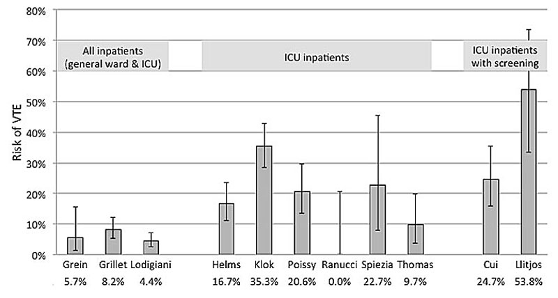 Figure 2 Risks of venous thromboembolism (VTE) in individual studies, obtained from simple proportions (n VTE / n at risk). Error bars represent 95% confidence intervals. ICU = intensive care unit