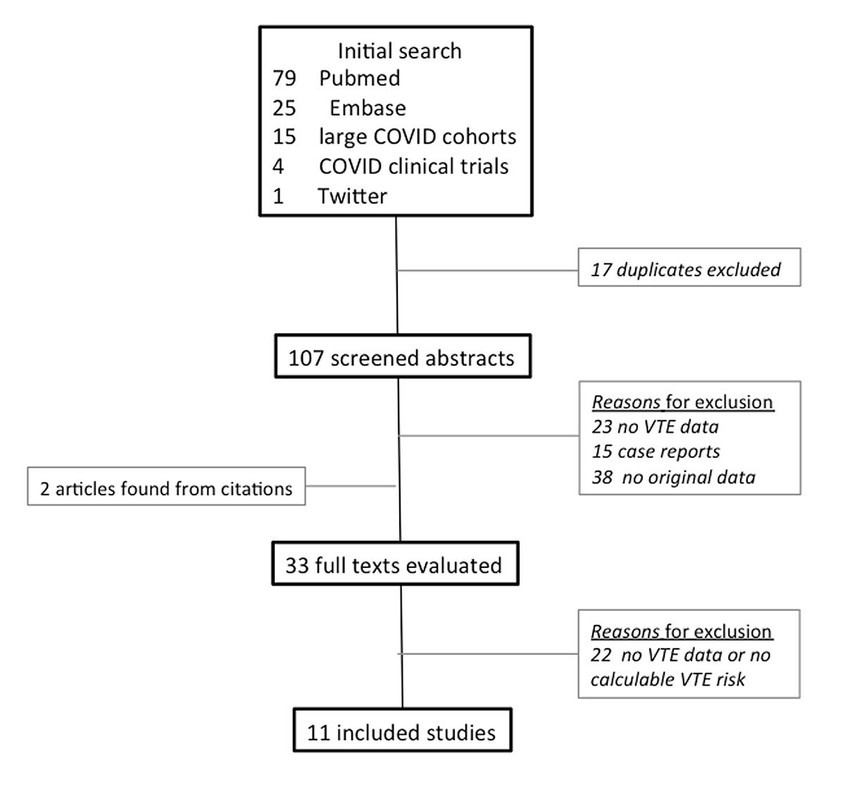 Figure 1 Flow-chart of the search for the risk of venous thromboembolism (VTE) among COVID-19 patients.