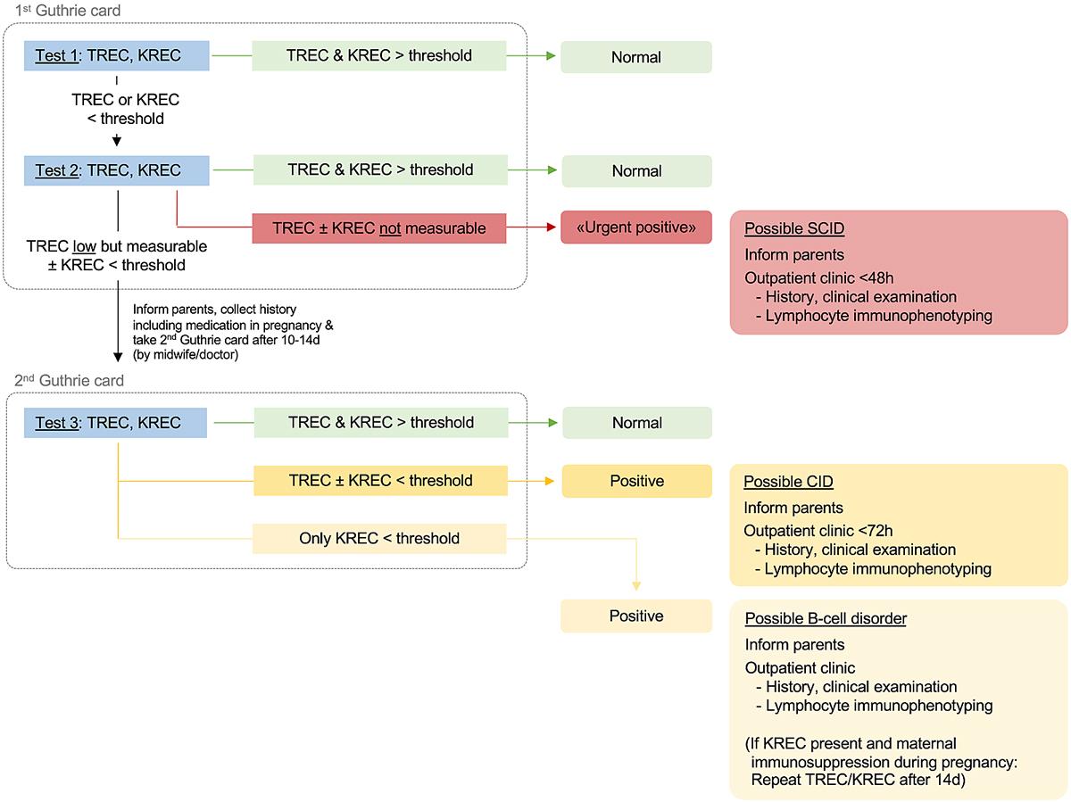 Preterm infants may have low TREC and/or KREC levels due to the immaturity of their immune system. Since preterm infants may nonetheless suffer from SCID, neonates with undetectable TRECs should still be urgently evaluated by a paediatric immunologist experienced in the management of PID and SCID, and relevant investigations must be performed. Preterm infants with low but detectable TRECs may be followed clinically and the TREC/KREC screening repeated every 2 weeks until results normalised or they reach 37 weeks adjusted gestational age, at which time lymphocyte enumeration via flow cytometry is performed [24].