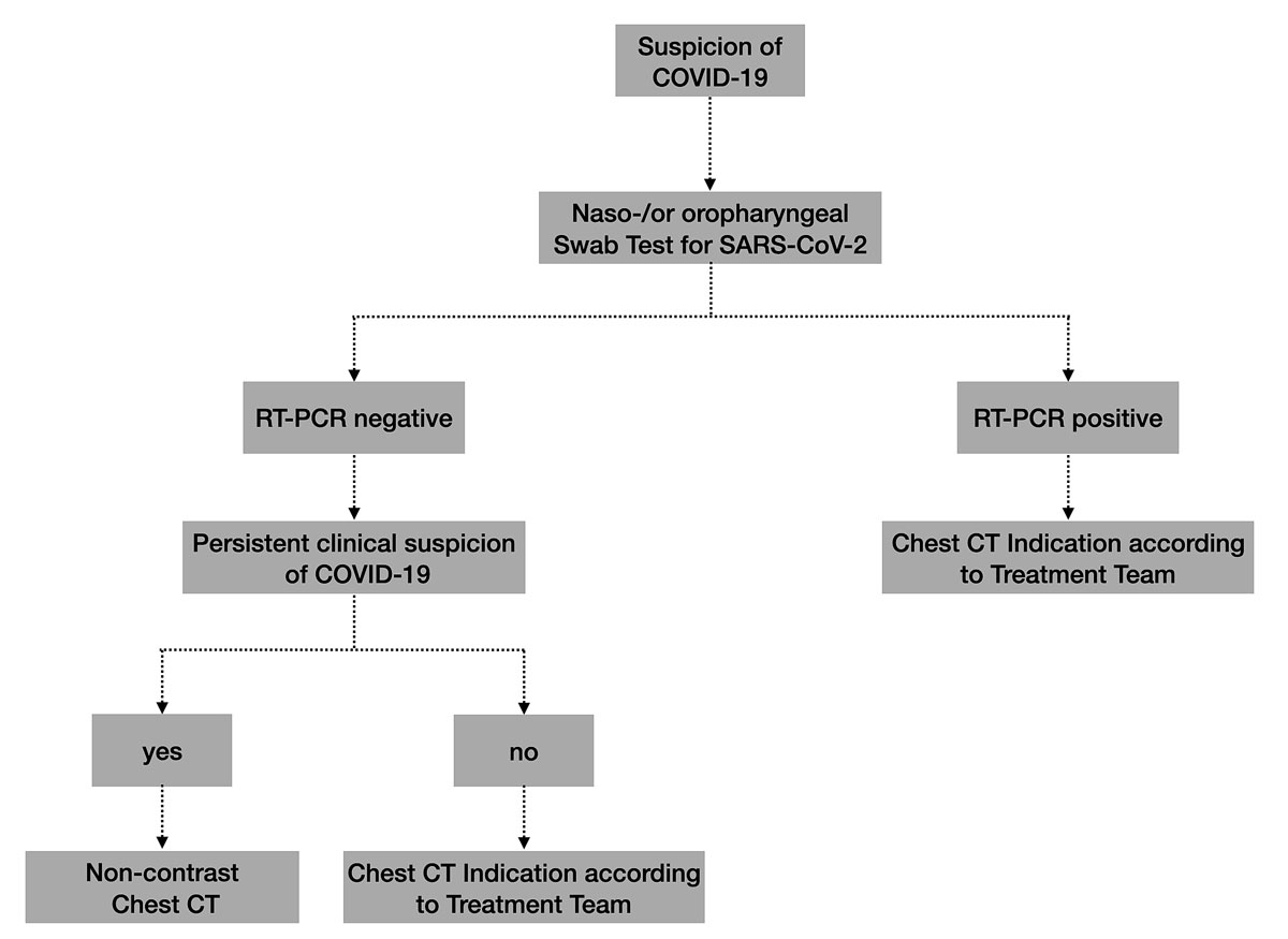 The SARS-CoV-2 virus (COVID-19) was initially observed in a group of Chinese patients with unclear pneumonia in Wuhan, Hubei [1] in late December 2019. The first positive case in Switzerland was confirmed on 25 February 2020 in a patient from canton Tessin, who most likely caught the virus during a visit to Milan, Italy [2]. The country has since been preparing for an imminent public health emergency caused by the pandemic. As of 14 May 2020, the Swiss healthcare system is facing a total of 30,463 corona virus-positive people [3]. With numbers of new infections decreasing after the first pandemic wave, the continuing endemic situation will continue to be a major challenge for the Swiss healthcare system. It remains crucial to separate the clinically low-symptomatic from the severely affected patients in order to offer a specific therapeutic strategy to every SARS-CoV-2 patient. Reports from Chinese cohorts describe an increasing role of imaging strategies in the detection and surveillance of COVID-19 patients because of insufficient testing sensitivity of real-time reverse transcription polymerase chain reaction (RT-PCR) tests [4]. Chest computed tomography (CT), with a reported sensitivity of up to 97% [5, 6], gained importance particularly in patients with false negative RT-PCR results.
