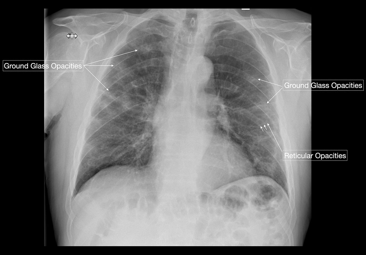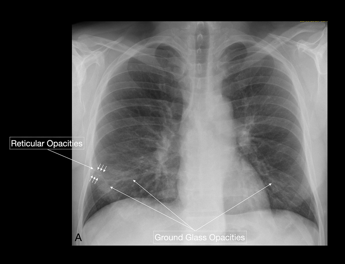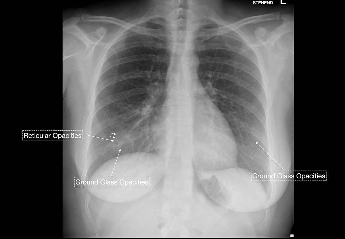 Figure 4 A 31-year-old female patient working as a waitress presented with episodes of high fever and progressive shortness of breath. Chest x-ray, performed at the same time as nasopharyngeal RT-PCR testing, showed very subtle evidence of faint ground glass opacities and with a superimposed reticular pattern, which raised the high suspicion of an early stage COVID-19 infection. No consolidation or pleural effusions were evident. RT-PCR test results available after 48 hours confirmed COVID-19.