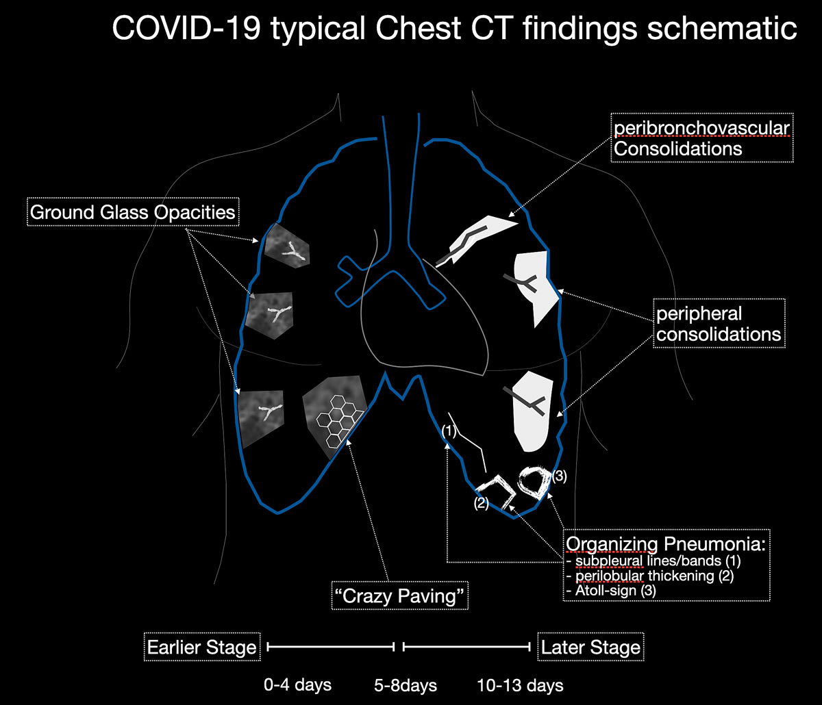 Figure 5 Schematic depiction of typical chest computed tomography (CT) findings for COVID-19: bilateral, focal ground glass opacities or consolidations with peripheral and basal distribution. Ground glass opacities – predominantly seen at earlier stages of infection – are gradually replaced by consolidations during progression of the disease. With progression repair mechanisms with an organising pneumonia pattern become evident, with particular CT signs, such as subpleural lines/bands, perilobular thickening or formation of atoll signs. Another unique pattern seen with disease progression is the “crazy paving” sign, a combination of ground glass opacities and thickened interstitial lines in a mosaic pattern of irregular paving stones.