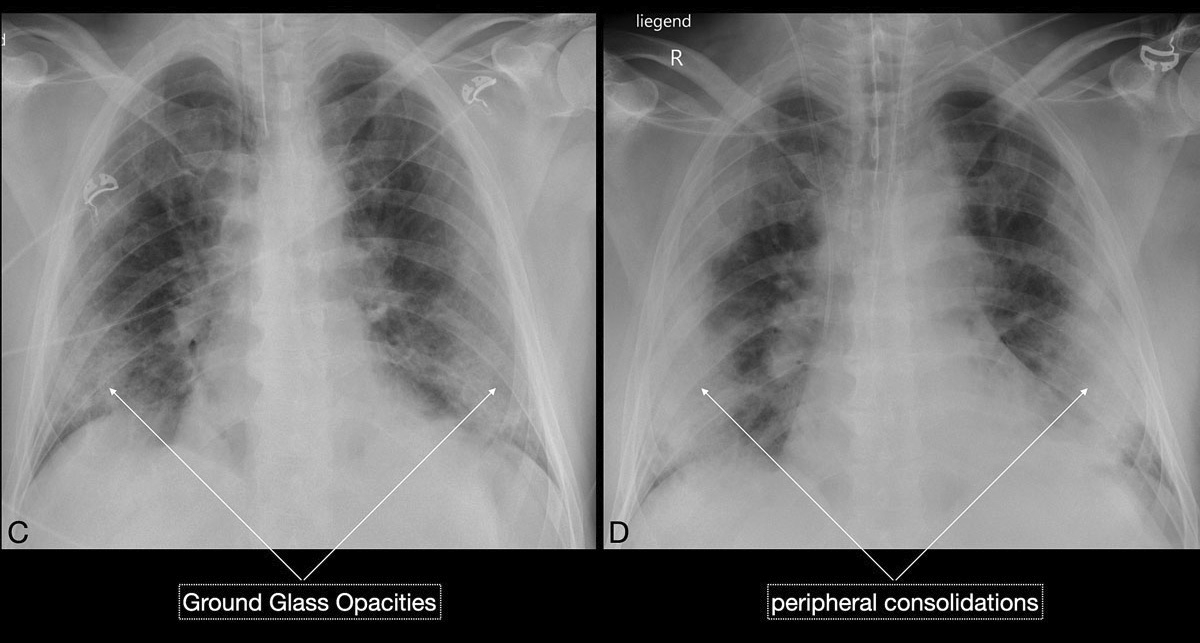 Figure 3 CD Chest x-ray (C) revealed extensive peripheral ground glass opacities, which became more consolidated (D) over the next 5 days.