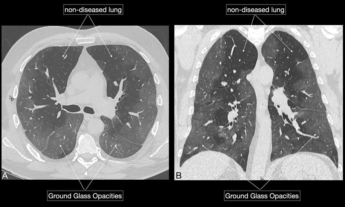 Figure 3 AB A 57-year-old male patient with cough, fever, myalgia and arthralgia for approximately 10 days was admitted to the emergency department. Laboratory work revealed lymphopenia, elevated lactate dehydrogenase, C-reactive protein and D-dimers. SaO2 was 82% on room air. RT-PCT test was positive for COVID-19. Chest computed tomography (CT) (A, B) revealed extensive ground glass opacities (Total Severity Score of 13/20 suggests a severe and critical course). Fairly immediate respiratory exhaustion led to intubation.