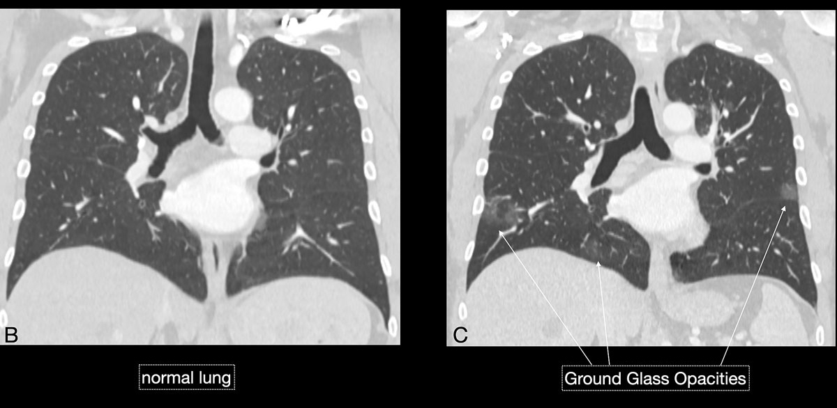 Figure 6 A A 54-year-old patient being treated for lymphoma returned from a US vacation and presented to the emergency department with myalgia, arthralgia, sore throat and pleuritc chest pain, but without fever or cough. Laboratory work revealed elevated C-reactive protein and D-dimer; a baseline RT-PCR test was negative for COVID-19. Chest x-ray (A) demonstrated subtle ground glass and reticular opacities. Clinical suspicion of COVID-19 persisted despite two consecutive negative nasopharyngeal swab TR-PCT tests.