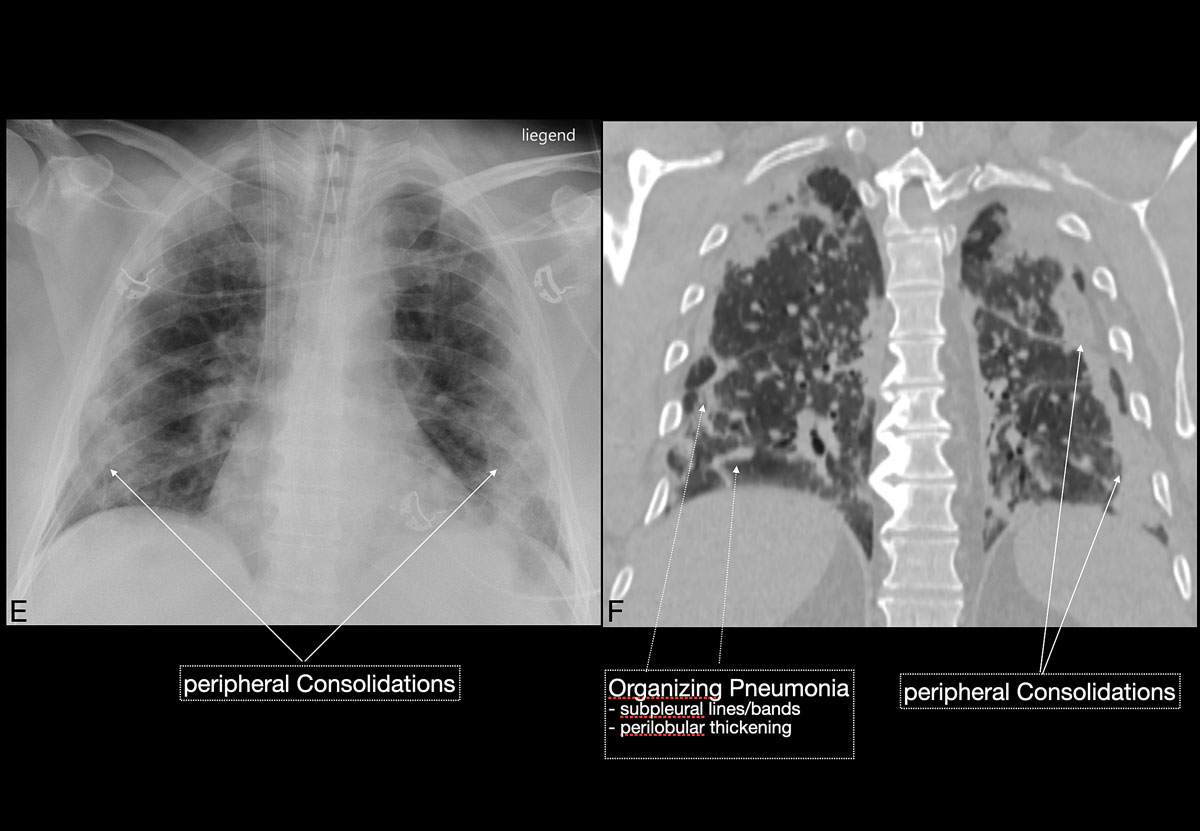 Figure 3 EF Over time the clinical condition worsened, chest x-ray (E) demonstrated persisting, but mildly improving peripheral consolidations, and chest CT (F) demonstrated features of reparative organising pneumonia. The patient’s condition deteriorated and he died from septic and cardiogenic shock 12 days after intubation.