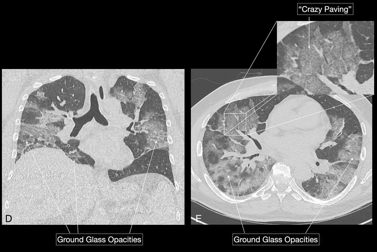 Figure 6 DE Over time the patient’s dyspnoea increased and the subsequent chest CT scan (D, E) confirmed worsening disease with increasing ground glass opacities and an apparent “crazy paving” pattern, the latter suggesting a progressive stage of disease.
