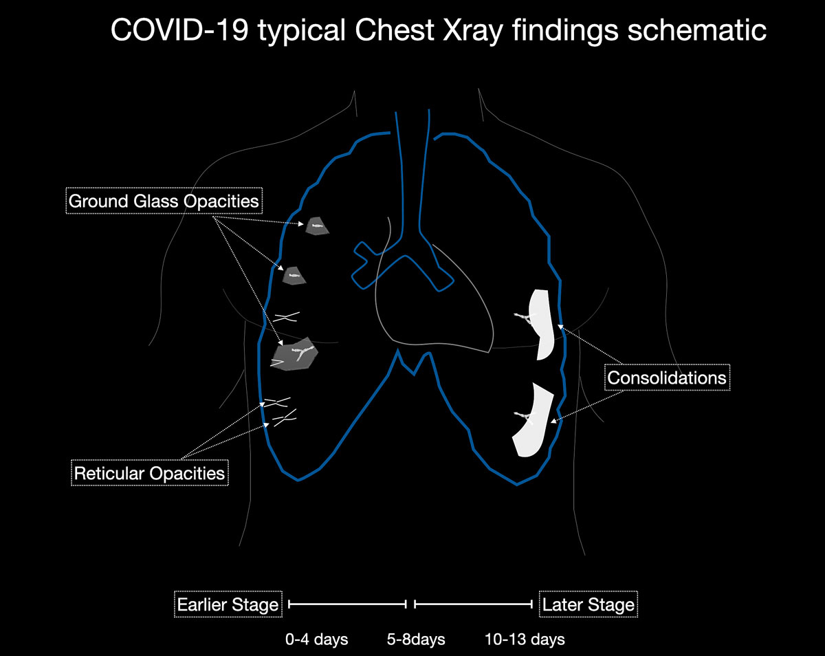 Figure 1 Schematic depiction of typical chest x-ray findings for COVID-19: bilateral, reticular and focal ground glass opacities or consolidative air space opacities in a peripheral and basal distribution. Earlier stage disease shows predominantly ground glass opacities; with progression pre-existing ground glass opacities transform into consolidative air space opacities.