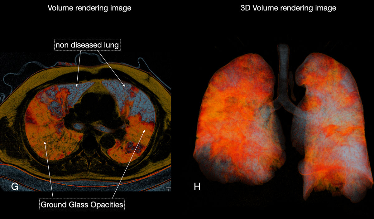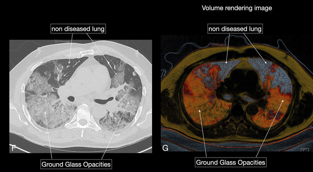Figure 6 FG Chest CT (F) and corresponding volume rendering (G) image demonstrated the increasing extent of diseased (orange) versus non-diseased (grey-blue) lung parenchyma.