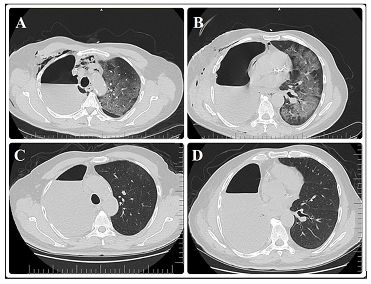 Figure 2 (A,B) Postoperative day 4, images of HRCT from different cross-sectional levels taken after fever. Alveolar opacity, vascular congestion and inter-septal thickening areas in diffuse ground glass density in both lobes of left lung. (C,D) Control HRCT images taken on discharge (17th) day. It was observed that the ground glass opacity in both lobes of the left lung has recovered almost completely.