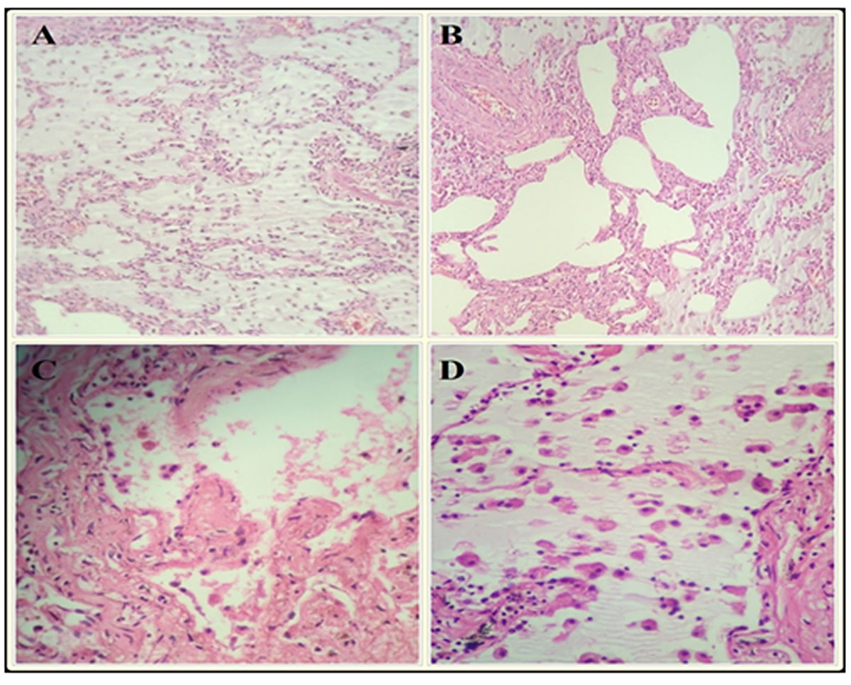 Figure 3 Early phase histological changes of COVID-19 pneumonia. (A) Alveolar oedema, intra-alveolar fibrin, pronounced protein and fibrin exudates. (B) Diffuse expansion in the alveolar wall containing proliferated interstitial fibroblasts and type II pneumocytes. (C) Focal fibroblast plugs in the interstitium. (D) Alveolar macrophage, multi-nucleated cells, prominent lymphocyte infiltrate and type II pneumocyte hyperplasia.