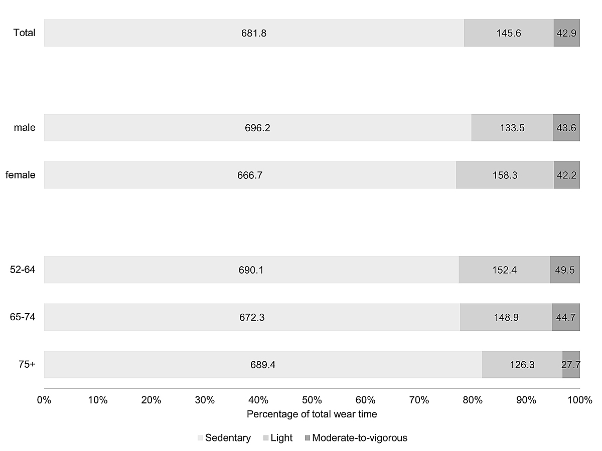 Figure 2 Average daily minutes (number in boxes) and percent of accelerometer measuring time (x-axis) spent in different levels of physical activity intensity, by sex and age group (n = 1314).