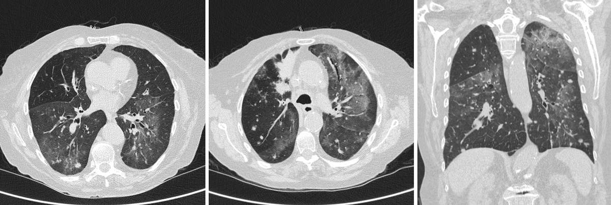 Figure 1 Coronary and sagittal ultralow-dose chest CT scan showing diffuse bilateral ground-glass opacities and multiple bilateral nodules.