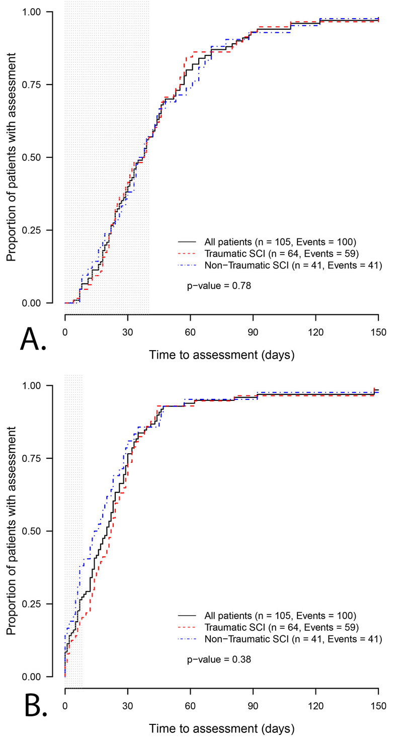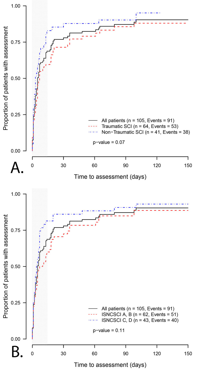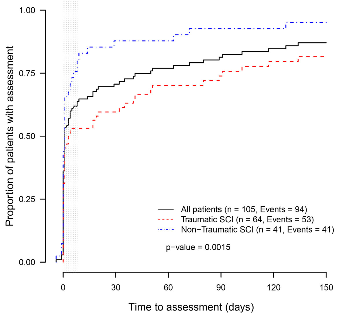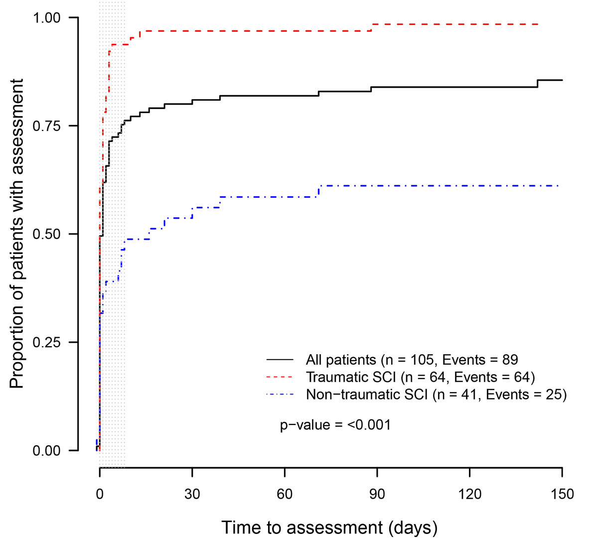 Graphical analysis was done by creating Kaplan-Meier plots. The recommended time of each examination/assessment was shown with grey shading. Visual and statistical subgroup analyses were performed for aetiology of spinal cord injury (i.e., traumatic versus non-traumatic), level of spinal cord injury (i.e., paraplegic versus quadriplegic) and completeness of spinal cord injury (i.e., motor complete versus sensor-motor incomplete according to ISNCSCI).