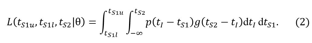 Concretely, the probability under model ϴ to observe a window of symptom onset of the index case (tS 1 l , tS 1 u ) and symptom onset in the secondary case on day tS 2 is defined in the original manuscript as