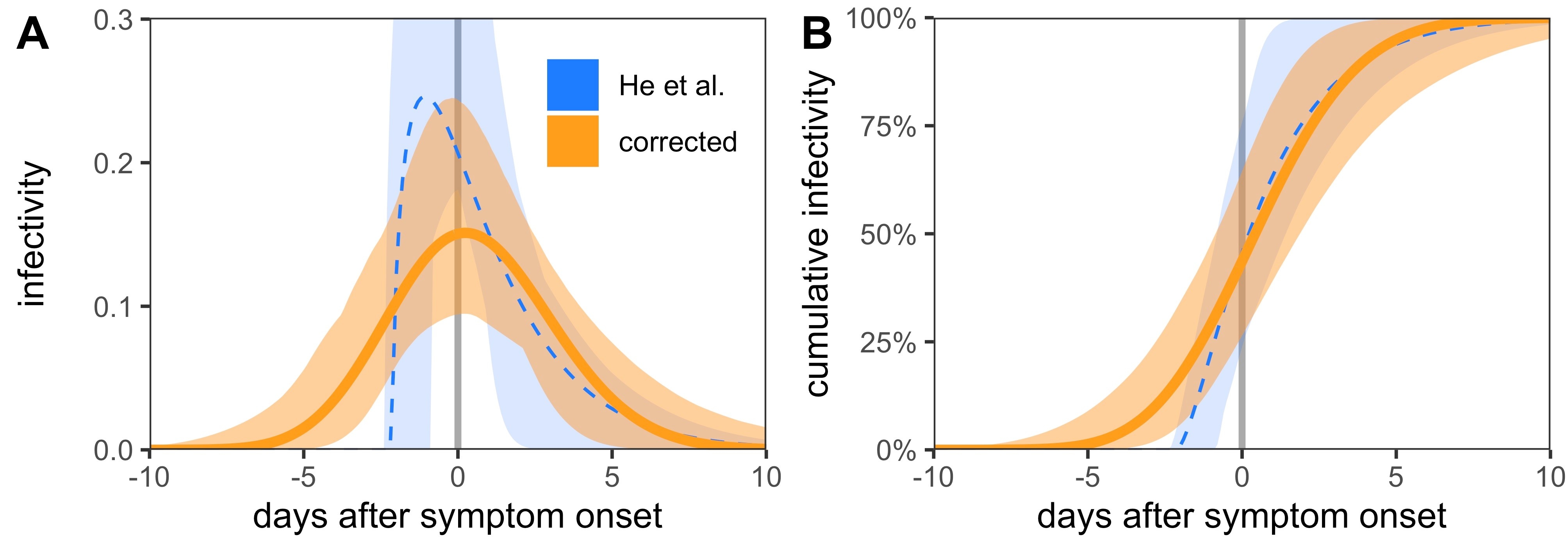 Figure 1 The infectivity profiles extracted from the serial interval data and the log-normally distributed incubation period, as performed in He et al. [1]. Here we used an adaptive grid search to reconstruct the likelihood landscape over the three parameters of the shifted gamma distribution. The confidence intervals are the range of the infectivity profiles that have a likelihood-ratio test statistic within 95% of a χ2 distribution with 3 degrees of freedom when compared with the maximum likelihood estimate. Panel A shows the probability density function and is analogous to figure 1C of He et al. The blue dashed line is the maximum likelihood estimate using the method from He et al. and the solid orange line is the corrected maximum likelihood estimate. Panel B shows the corresponding cumulative density functions.