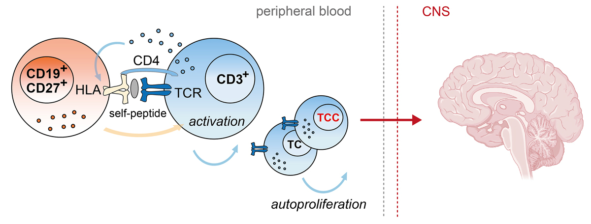 Figure 1 Physical crosstalk in which activation of Th1 cells (blue) by memory B cells (orange) leads to an increased spontaneous cell division, i.e., autoproliferation, in patients with multiple sclerosis. These autoproliferating T cells are enriched for brain-homing T cell clones (TCCs) that are specific for a protein, RASGRP2, which is expressed in B cells and in the brain. The brain image was created with BioRender.com.