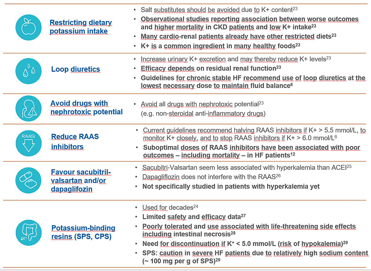 CPS = calcium polystyrene sulphonate; CKD = chronic kidney disease; HF = heart failure; K+ = potassium; RAAS = renin-angiotensin-aldosterone system; SPS = sodium polystyrene sulphonate.