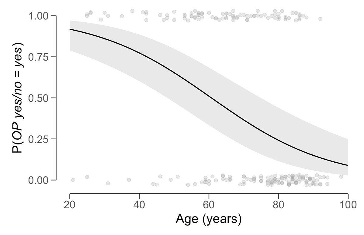 Op: Operation, Yes(1): Patients who underwent surgery after primarily being treated conservatively, No(0): completely conservatively treated patients, P: likelihood, grey dots: every dot represents one patient. Grey banner: 95% confidence interval, black line: operation likelihood according to patient’s age.