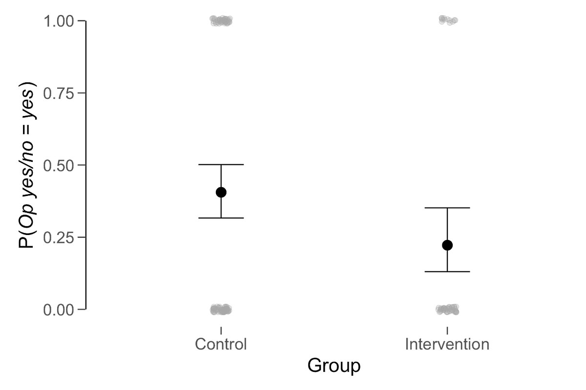 Op: Operation, Yes(1): Patients who underwent surgery after primarily being treated conservatively, No(0): completely conservatively treated patients, P: likelihood, grey dots: every dot represents one patient, black dot: represent the mean likelihood to get an operation, plot: shows the 95% confidence interval of the operation likelihood.