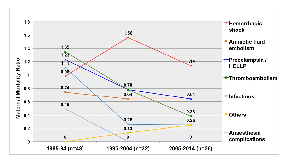 Figure 2 Direct maternal mortality in Switzerland 1985–2014 per 100,000 live births, separated by cause of death.