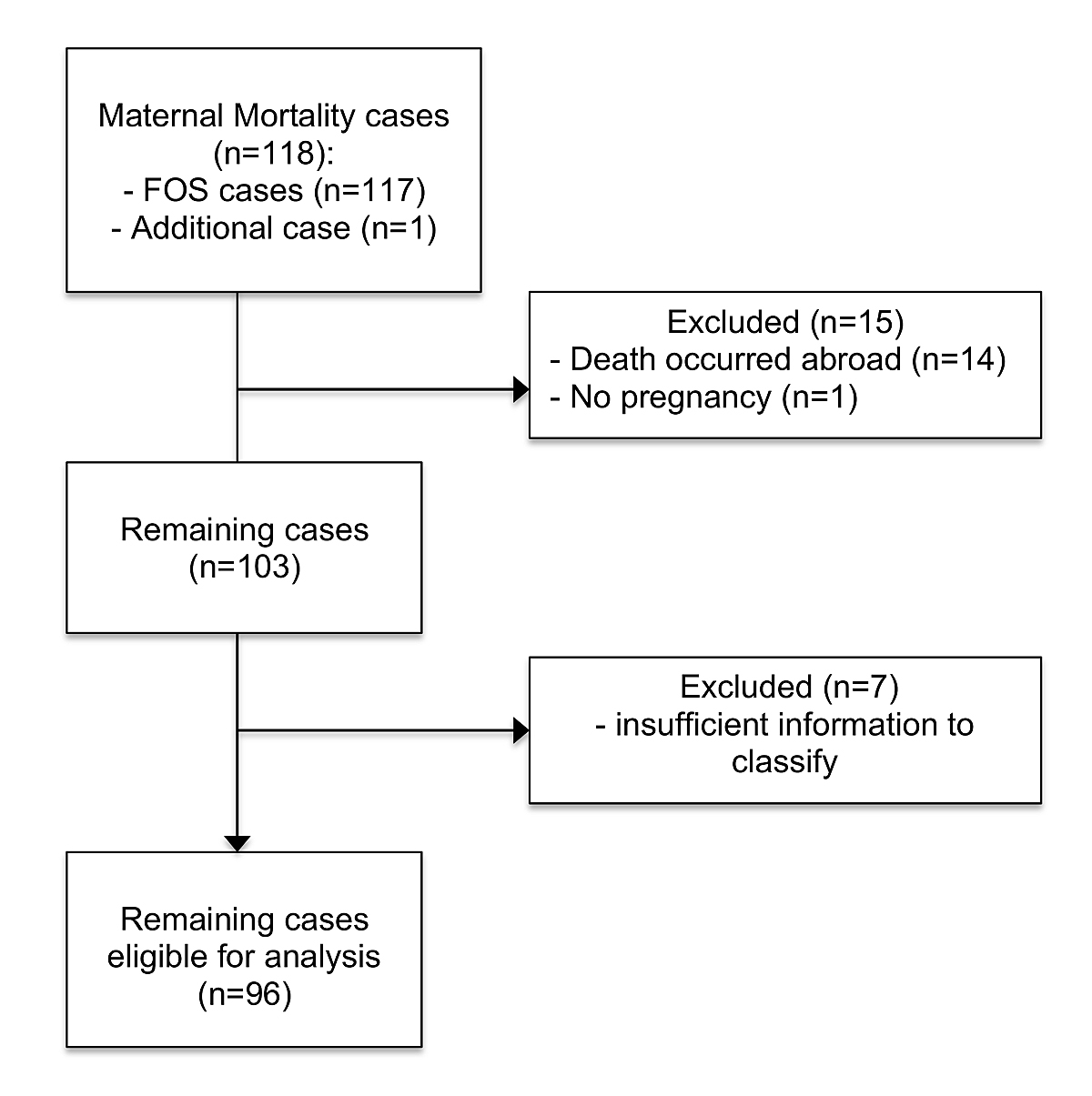 In total, 117 maternal deaths were reported to the FSO between 2005 and 2014 (fig. 1). One additional case was found by searching the archive of the IRM. The woman in question had an accident in the early weeks of pregnancy and therefore it can be classified as a pregnancy-independent case. Fourteen cases had to be excluded as a result of lack of information because the deaths had occurred abroad. The only information given for these cases was the ICD-code R99 (Other ill-defined and unspecified causes of mortality) and, in 13 cases, the time that had passed since childbirth (0–331 days). One other case was excluded as the autopsy stated that the woman was not pregnant at the time of her death and had not given birth in the previous year. Seven cases had to be excluded because only ICD-10 codes and no further detailed information on the circumstances of these deaths were available (table 1). Therefore, 96 cases were eligible for a detailed analysis.