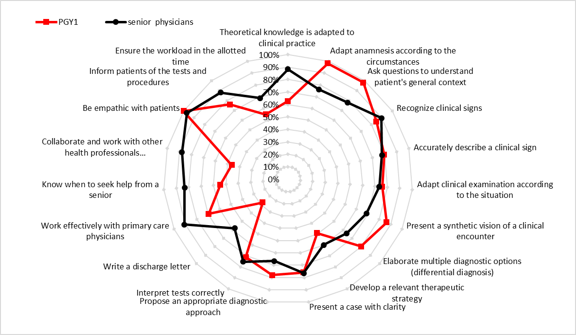 Large majorities of residents considered themselves capable of accurately carrying out a medical history (98.3%), identifying clinical signs (84.7%) and dealing with ethical and confidentiality problems (91.5%). Senior physicians confirmed that these skills are well-mastered by junior residents (table 3, questions 3, 5, 6, 20) and that residents’ knowledge base is adapted for entering postgraduate training (table 3, question 1). The focus groups corroborated these statements: