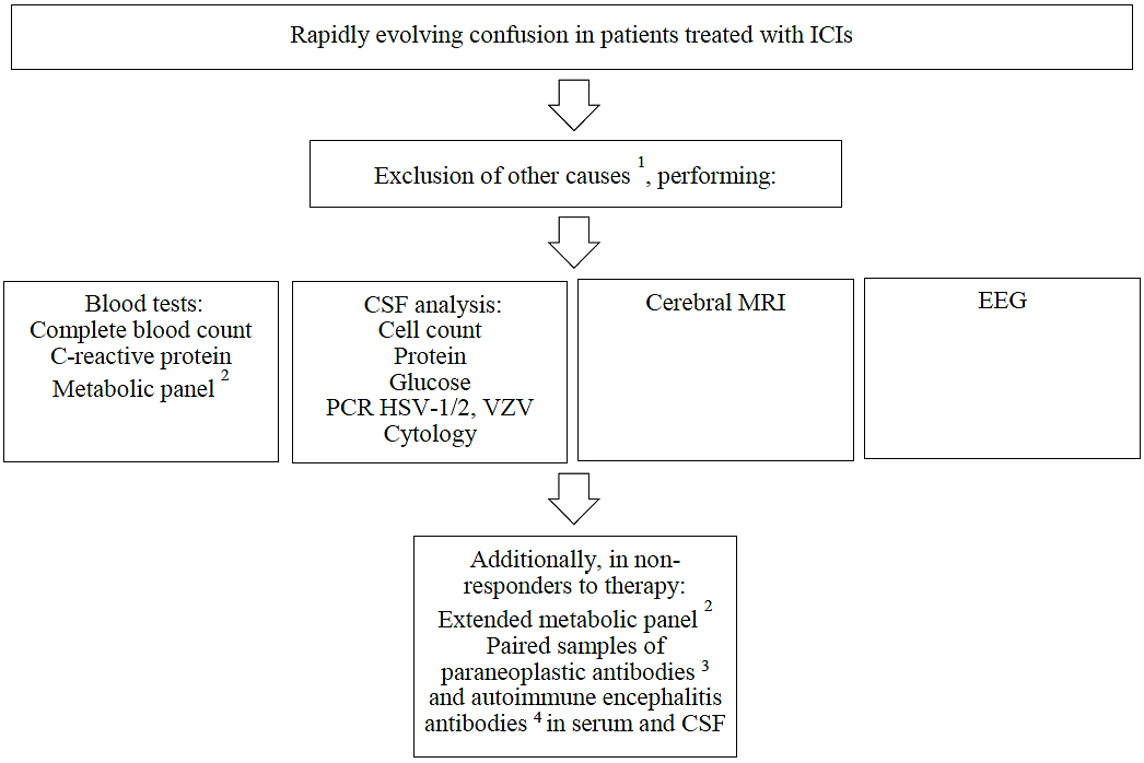 New indications for ICI therapy and combinations with other therapeutic strategies (e.g., chemotherapy) are in preclinical and clinical testing. The incidence of and risk factors for ICI-associated encephalitis will be reported accordingly. To date, ICI encephalitis is a diagnosis of exclusion. However, we propose that the diagnosis can be made after clinical evaluation and performing basic laboratory analysis, MRI and EEG. Expanded testing for rare autoimmune diseases of the brain should be reserved for therapy-refractory cases.