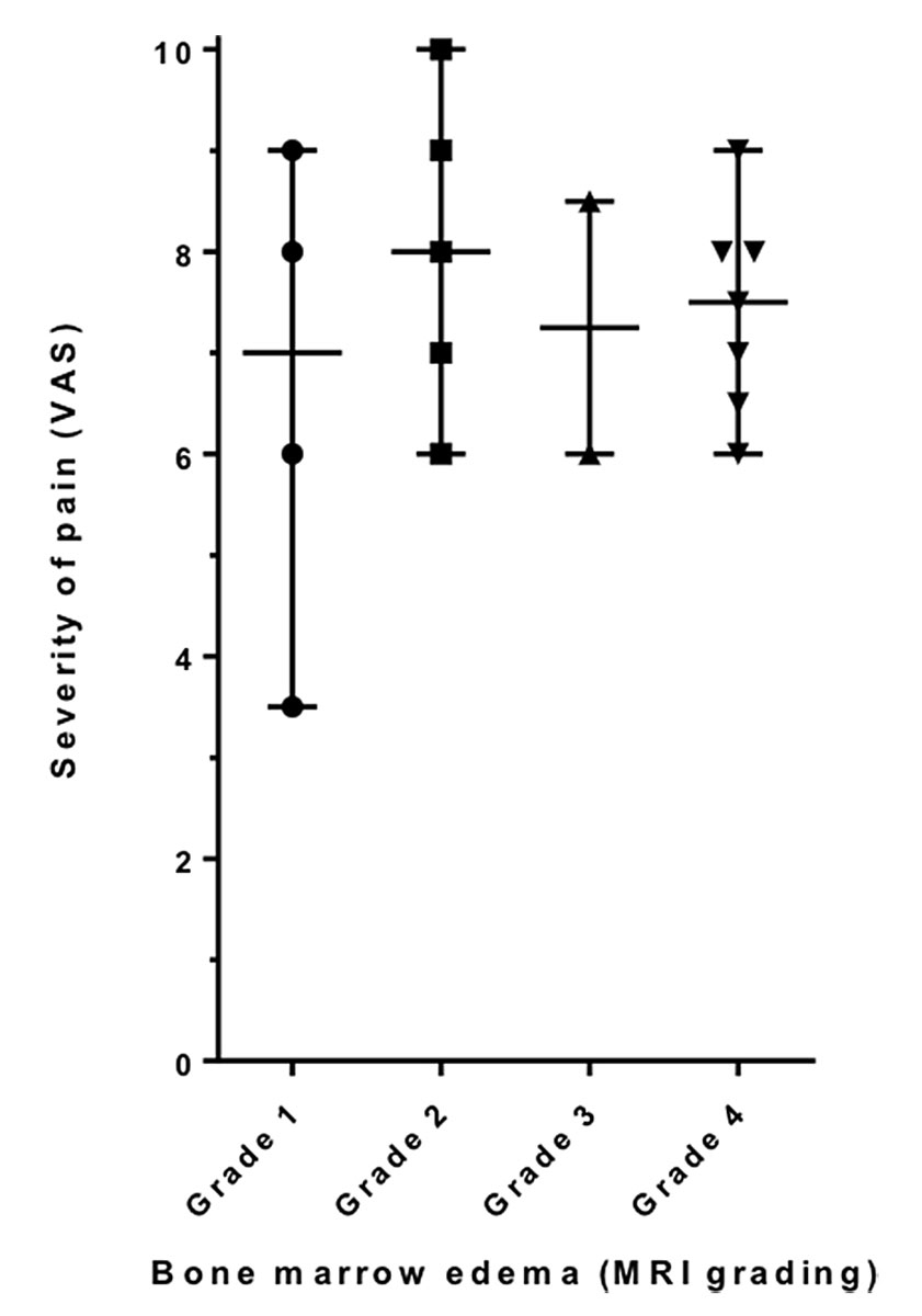 As shown in figure 3, the MRI findings did not correlate with the intensity of pain before bisphosphonate administration, as only three of the nine participants with severe pain (VAS 8 or higher) had grade 4 changes on an MRI scan. On the other hand, the four participants with grade 1 changes in their magnetic resonance images had a mean value of pain of 6.6, which is only slightly lower than in the overall group (mean value of pain overall 7.4).