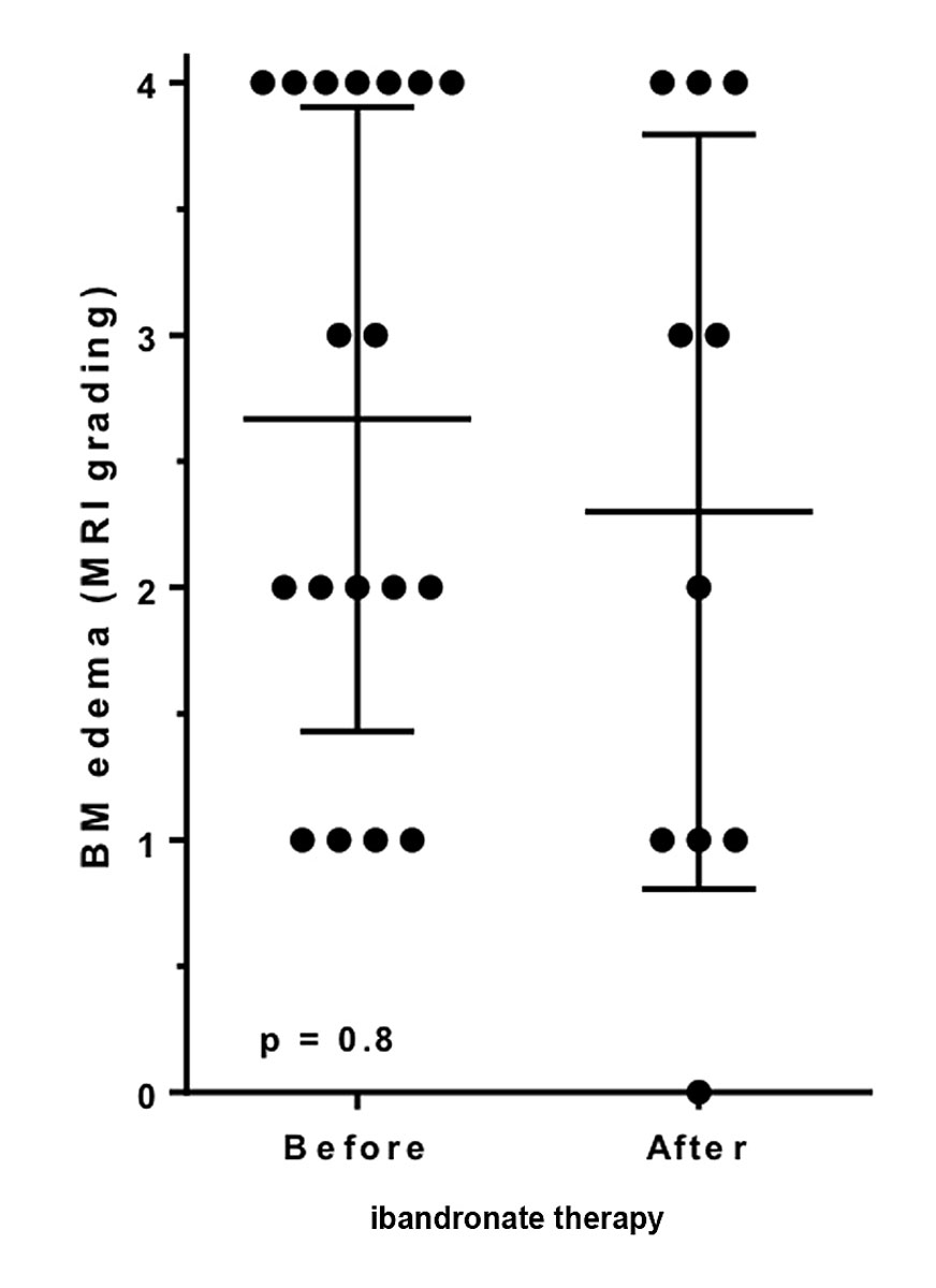 Figure 5 Severity of MRI changes before and after ibandronate therapy. The changes on MRI scan did not significantly differ before or after ibandronate therapy