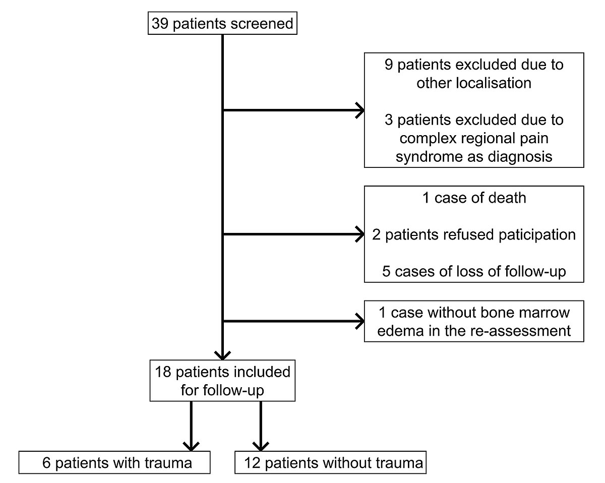 Between April 2012 and February 2016, 39 patients were screened who had received ibandronate intravenously because of a bone marrow oedema. Twelve patients had to be excluded (nine patients due to other localisations, three patients due to complex regional pain syndrome). Six patients had to be excluded due to loss of follow-up (one death happened three years after our treatment, due to a cardiac event not related to the ibandronate administration; five patients did not respond to the study invitation), and two patients refused the participation. After the re-assessment of the MRI, one patient had to be excluded because no bone marrow oedema was present. Thus, we included 18 participants in total (fig. 1).