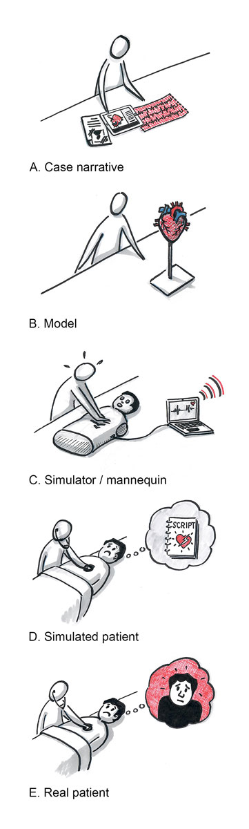 Whether to use SPs or RPs in assessment is mostly a continuation of the debate related to education: assessment must be aligned with the particular aims and level of the education. Ideally, it should use the same didactical instruments that were used in the teaching. Hence, the patient representations shown in figure 1 are also relevant and utilised for summative assessment at different educational levels.
