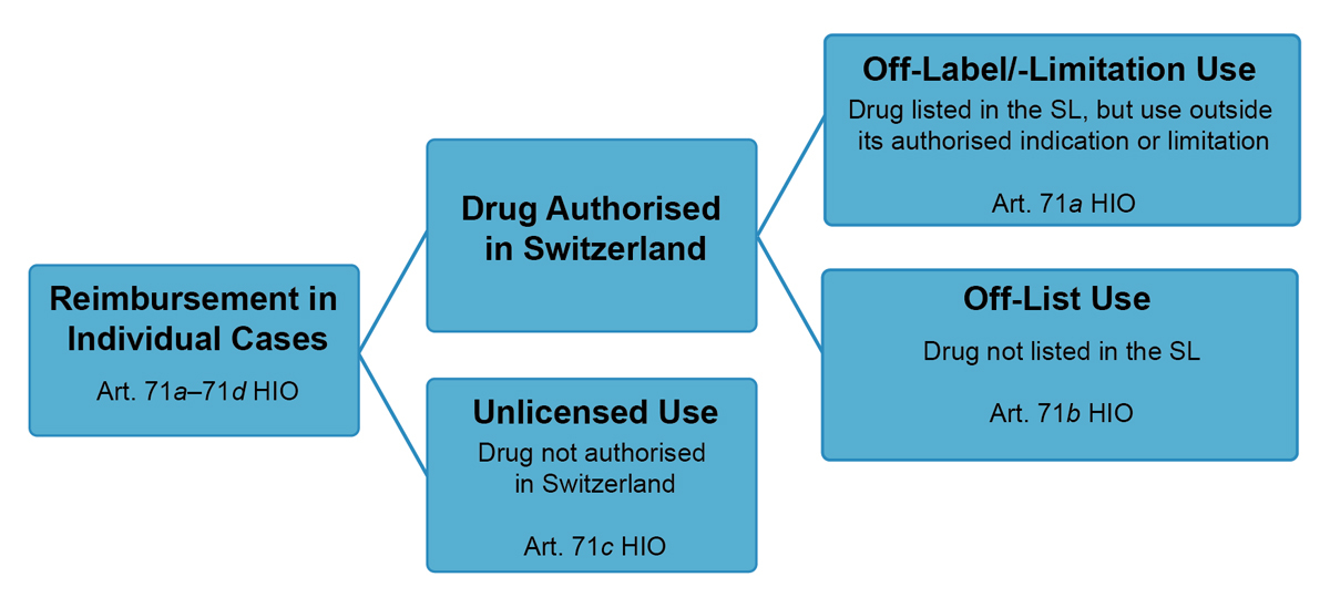 In addition to the reimbursement of drugs listed in the SL, reimbursement of non-listed drugs is possible in individual cases, i.e., off-list use according to art. 71b HIO (see fig. 2).6