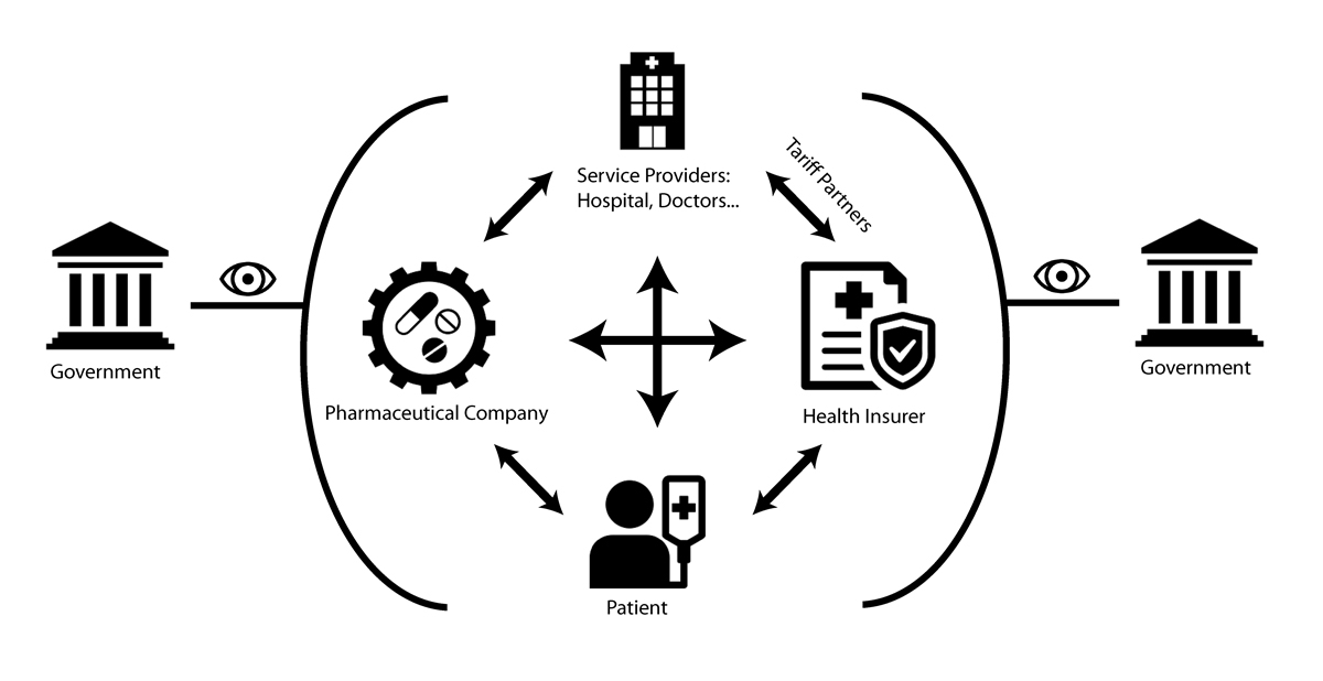 For the evaluation of potential reimbursement solutions, a basic understanding of the relationships between the different parties involved in the reimbursement of therapeutic products is necessary. In Switzerland, up to five main parties are usually involved in this process: