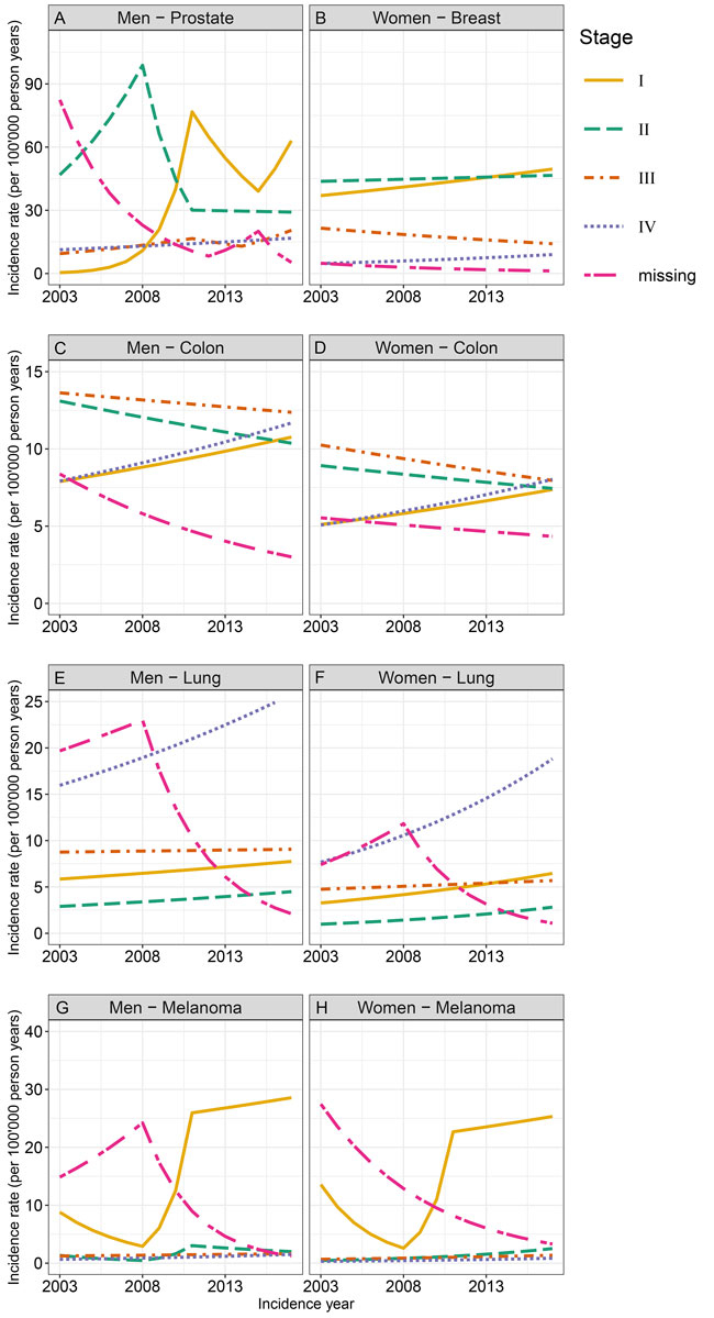 Figure 3 Age-standardised incidence rates by stage for cancers of the prostate, breast, colon/rectum, and lung, as well as for melanoma from 2003 to 2017, by sex, in the canton of Zurich.
