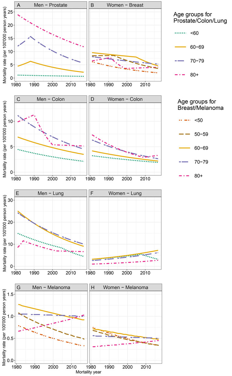 Figure 4 Age-standardised mortality rates by age group for cancers of the prostate, breast, colon/rectum, and lung, as well as for melanoma from 1981 to 2017, by sex, in the canton of Zurich.