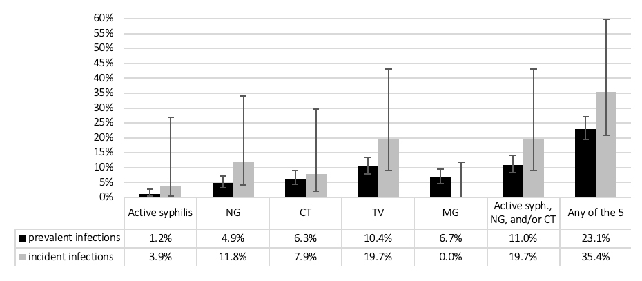 Active syphilis, NG, CT, TV, or MG | 23.1 (19.5–27.1) | 10.9 (5.6–19.5) | |