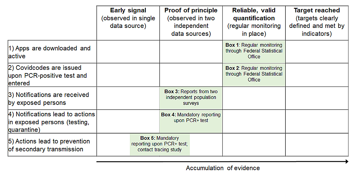 Figure 1 Quality of evidence for SwissCovid app effectiveness. Row labels: necessary technical, procedural and behavioural conditions for digital contact tracing to be effective. Columns: milestones in evidence accumulation. Green boxes indicate available data sources for evidence assessments; quantitative information related to green boxes are provided in the main text.