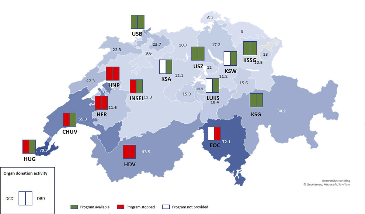 CHUV = University Hospital Lausanne; DBD = donation after brain death; DCD = donation after circulatory death; EOC = Cantonal Hospital Lugano; HDF = Cantonal of Hospital of Valais; HFR = Cantonal Hospital Fribourg; HNP = Cantonal Hospital Neuchatel; HUG = University Hospital Geneva; Insel = University Hospital Berne; KSA = Cantonal Hospital Aarau; KSG = Cantonal Hospital of Graubünden; KSW = Cantonal Hospital Winterthur; KSSG = Cantonal Hospital St Gallen; LUKS = Cantonal of Hospital of Lucerne; USB = University Hospital Basel; USZ = University Hospital Zurich