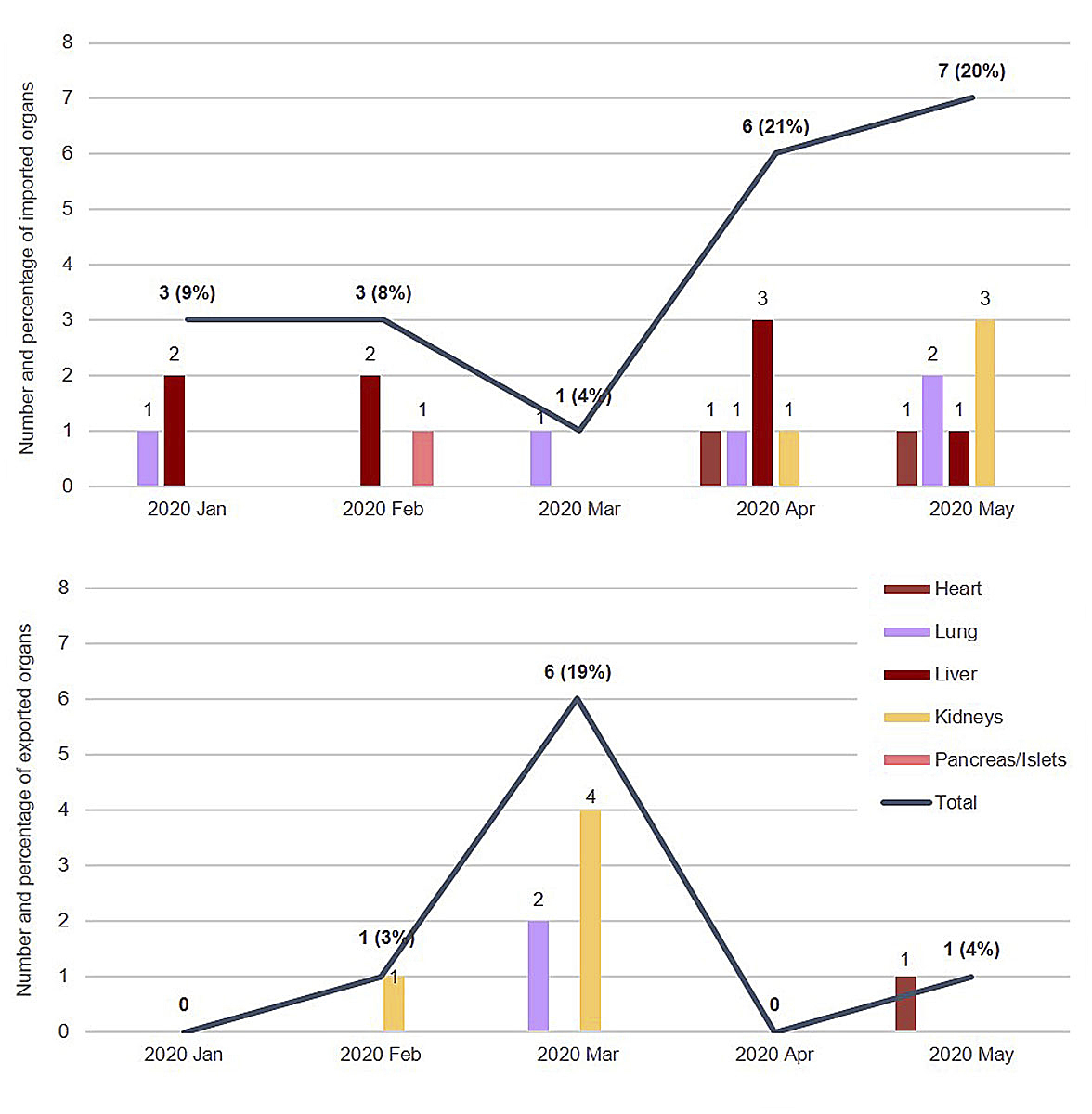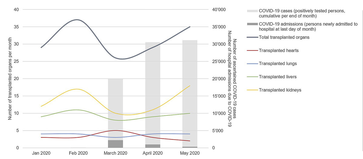 To assess the impact of the COVID-19 pandemic on the overall transplantation activity in Switzerland, we compared total and individual numbers of transplanted organs with the total number of ascertained COVID-19 cases over the period from 1 January 2020 to 31 May 2020. Data on transplanted organs from deceased donors were accessed by an automated database query in the Swiss Organ Allocation System (SOAS) and arranged using the freely available software R (version 3.6.0). Numbers were grouped by organ and month. Multi-organ transplantation counted to each of the respective organ and “double transplantations” (i.e., both kidneys to the same recipient) counted as two organs.