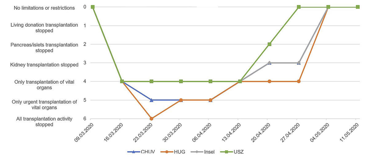During normal conditions, a total of six university or tertiary hospitals provide transplant programmes for one or several organs, including kidney and liver transplantation from living donors. Figure 2 shows the availability of organ transplant programmes across Switzerland from 9 March 2020 to 11 May 2020, according to the stepwise shutdown approach used during the pandemic in Switzerland. Transplantation from living donors, pancreas/islets transplantation and kidney transplantation was stopped from 16 March to 13 April in all centres nationwide. At HUG in Geneva and CHUV in Lausanne – located in regions with the highest COVID-19 prevalence – transplantation was limited to vital organs and urgently listed patients only during the same period. At HUG, transplant activities even completely ceased for one week. From mid-April, transplant activities were resumed step-by-step, first at centres in the least affected eastern part of Switzerland (i.e., in Zurich), subsequently also at centres located elsewhere in Switzerland, and ultimately in Geneva.