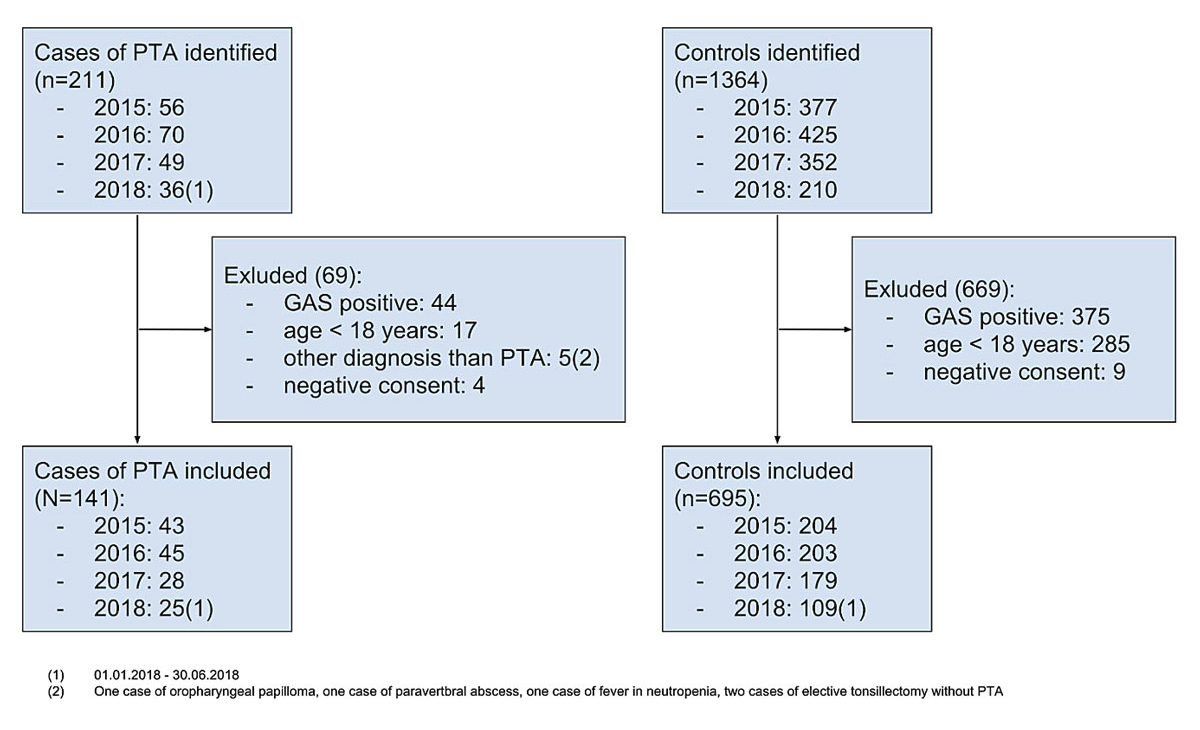 Figure 1 Cases and controls identified, excluded and included. GAS = group A β-haemolytic streptococcus; PTA = peritonsillar abscess