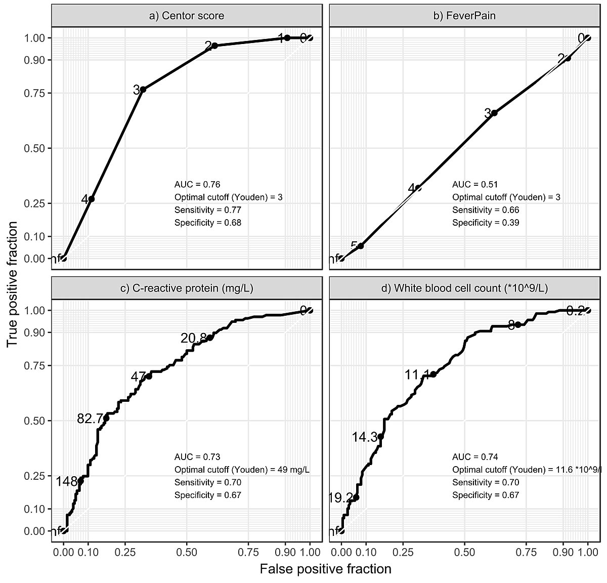Figure 2 shows the ROC curves for the Centor criteria and the FeverPAIN scores, C-reactive protein and the white blood cell count. The FeverPAIN score performanced was close to that of a random classifier (area under the curve [AUC] 0.51, sensitivity 0.66, specificity 0.39.). The Centor criteria, C-reactive protein and white blood cell count performed similarly (AUC 0.76, 0.73 and 0.74; sensitivity 0.77, 0.70 and 0.70; specificity 0.68, 0.67 and 0.67, respectively).