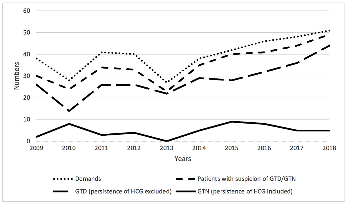 Figure 2 Evolution of recruitment. GTD = gestational trophoblastic disease; GTN = gestational trophoblastic neoplasia; HCG = human chorionic gonadotropin
