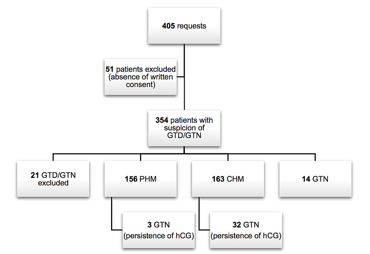 Figure 3 Flowchart of reference centre cases reviewed and final diagnosis. CHM = complete hydatidiform mole; GTD = gestational trophoblastic disease; GTN = gestational trophoblastic neoplasia; hCG = human chorionic gonadotropin; PHM = partial hydatidiform mole