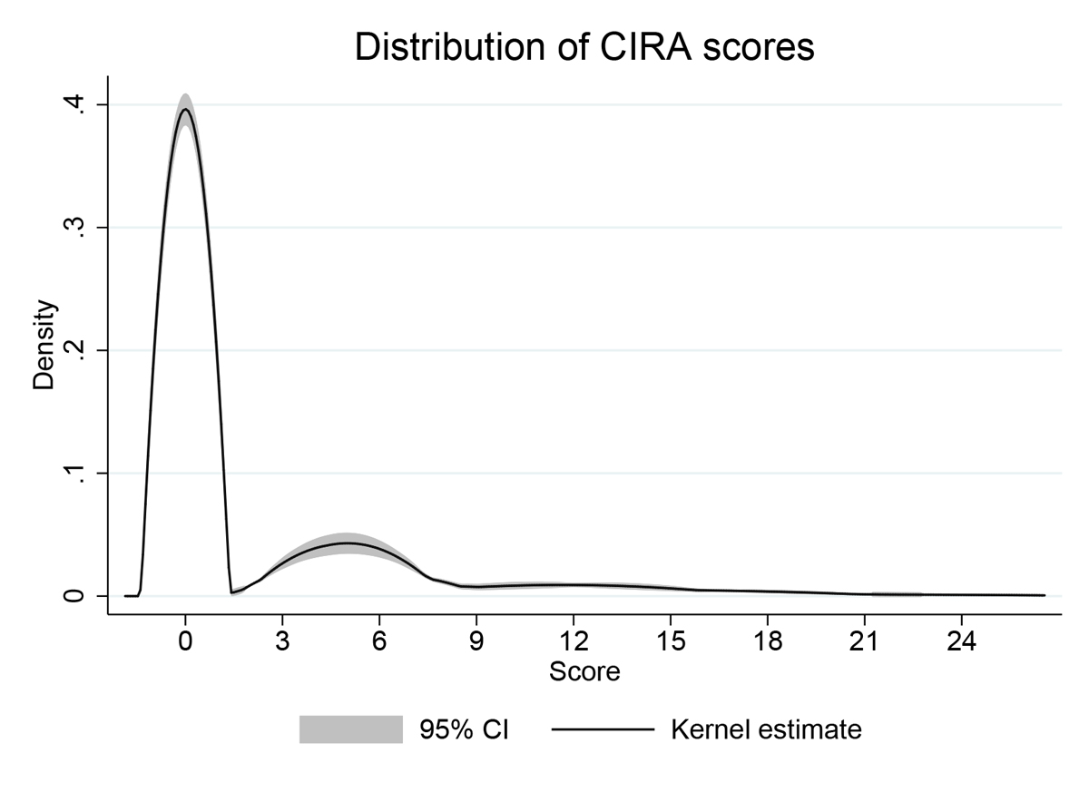 Figure 1 Distribution of CIRA scores in the development sample (n = 365). Kernel density with adaptive estimator.