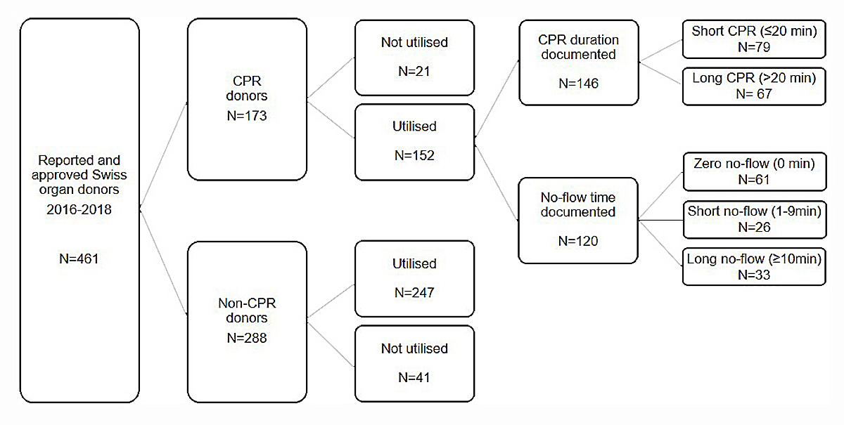 For utilised (i.e., at least one organ transplanted) donors after CPR we compiled additional data on the donors’ medical history, laboratory and supplementary diagnostic results, and the circumstances of CPR. For the latter, all medical and paramedical reports available in SOAS were individually checked by the first author of this study. Additional information on circumstances of CPR included setting (in- vs out-of-hospital, lay vs professional rescuer), estimated time of the event necessitating CPR, no-flow time, low-flow time to return of spontaneous circulation (ROSC), extra-corporeal membrane oxygenation (ECMO) usage, and the estimated duration of all above listed procedures. If the time of the event necessitating CPR was not appropriately documented, 1 hour prior to admission to hospital was used as the default estimated time of event [9]. For further analysis, we grouped the utilised donors after CPR regarding documented duration of CPR and no-flow time, respectively. A study population flowchart is displayed in figure 1.