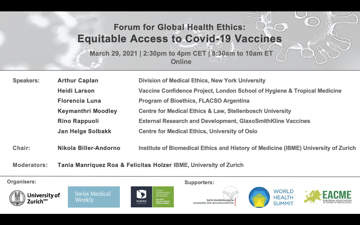 Figure 3 Invitation to the Forum for Global Health Ethics: Equitable Access to COVID-19 Vaccines (online event ‒ click here to join the event, password 621417. No registration needed.)