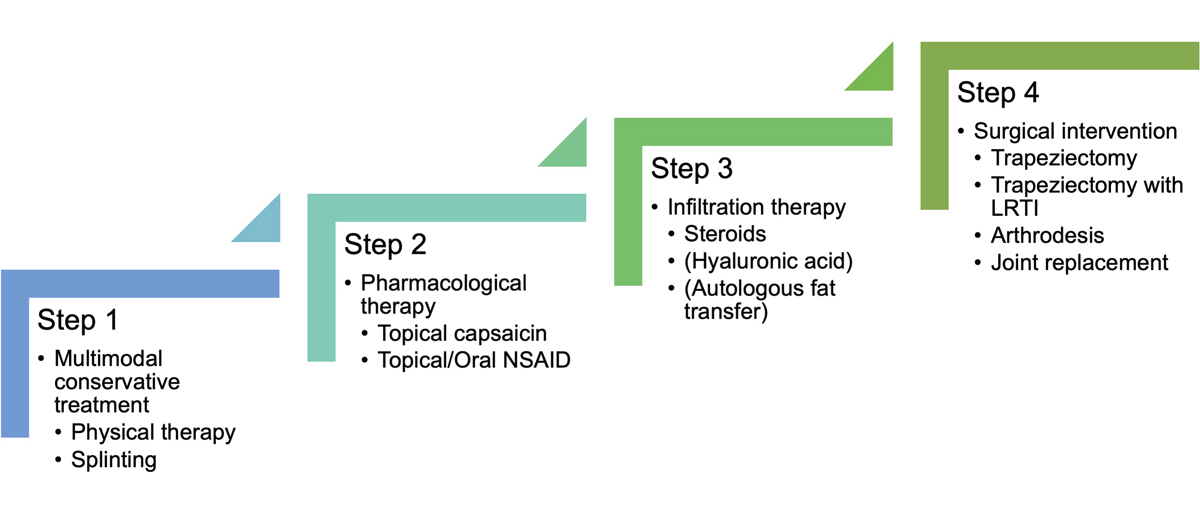 Step 1: Multimodal conservative treatment, including education, physical therapy and splinting. Specific hand therapy may apply physical anti-inflammatory and analgesic treatments, as well as instruct correct use of the weakened thumb.