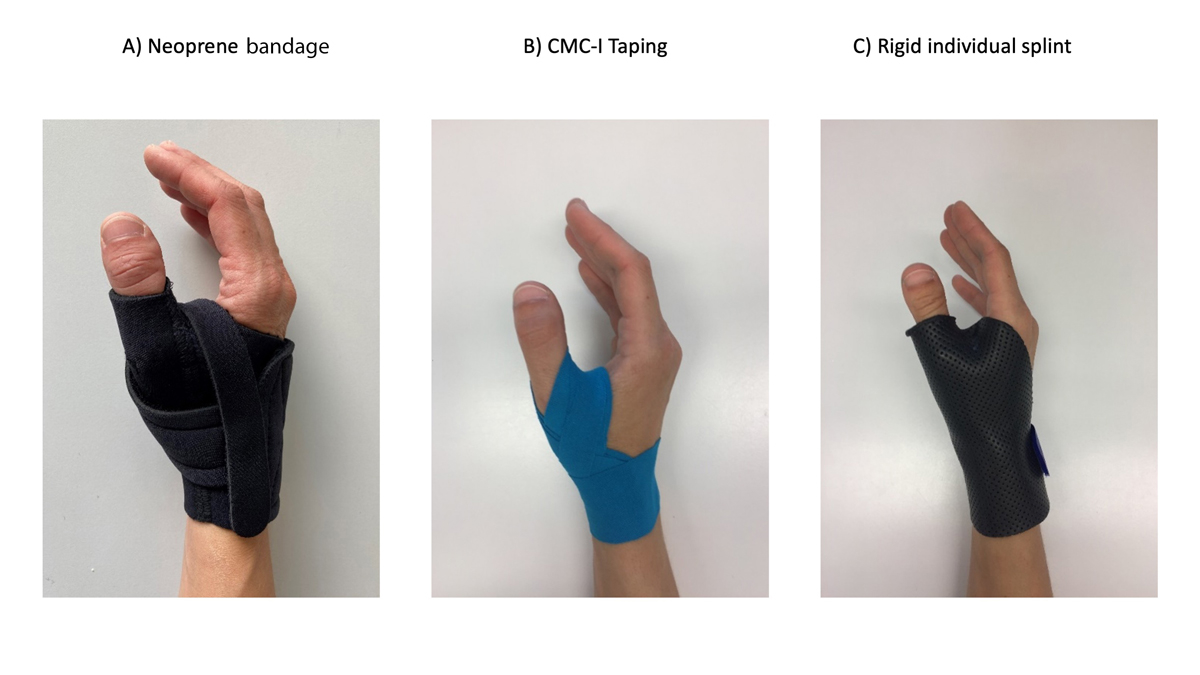 Figure 3 Different splints of the TMC joint. The right splint has to be chosen according to the patient’s needs and demands. Neoprene bandages (a) provide a high level of comfort and serve as insulation layer. Taping (b) presents a good alternative, especially for those needing to wear gloves at work (e.g., healthcare professionals). Rigid individual splints (c) provide the highest level of stability.
